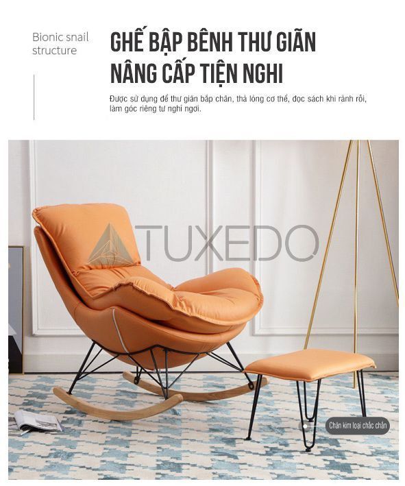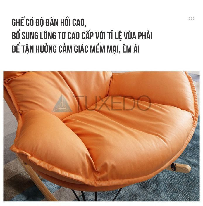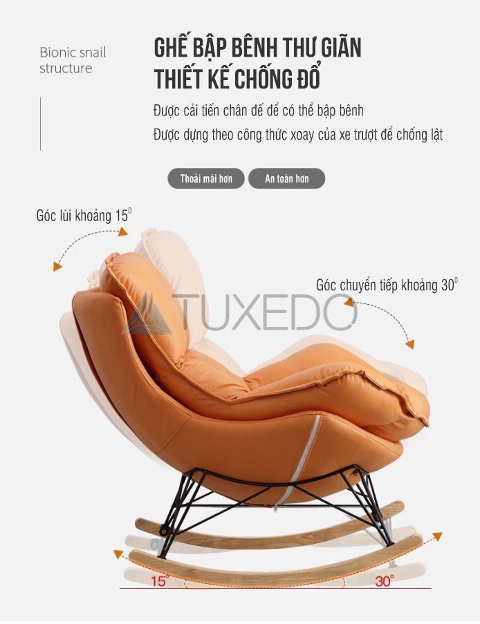 Ưu điểm lớn nhất của ghế bập bênh thư giãn của Tuxedo Corp đó là chất liệu nệm lưng ghế với độ đàn hồi tốt: lõi bông nhồi chất lượng cao, thoáng khí bọc da simili sang trọng, dễ vệ sinh - với rất nhiều lựa chọn màu sắc khiến chiếc ghế bập bênh này trở thành một món đồ trang trí nội thất hiện đại phù hợp với bất cứ không gian nào trong gia đình bạn.
