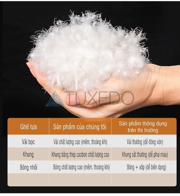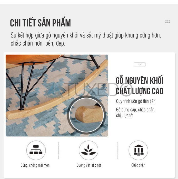 Khung ghế bập bênh của Tuxedo Corp được sản xuất từ chất liệu thép sơn tĩnh điện cực kì chắc chắn và có khả năng chịu lực tốt (khối lượng lên đến 200kg)